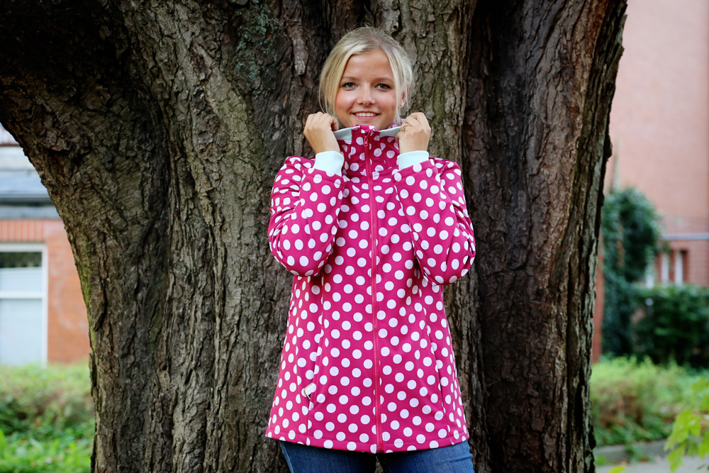 Ich liebe die Kombi pinke Punkte mit Bündchen in Mint – fühle mich irgendwie gleich 10 Jahre jünger, hihi. Nadine hat übrigens ganz viel neuen Softshell reinbekommen – ich würde ja so gerne noch eine Jacke mit Tropfen nähen!