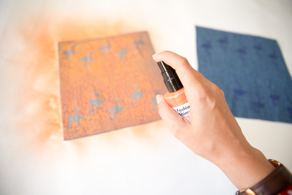 Benutzt habe ich dafür das Fashion Shimmer Spray von Marabu, die extra für dunkle Textilien gedacht sind. Legt auf jeden Fall Papier unter eure Textilien, damit nichts durchdrückt. Testet das Spray einmal auf einem Teststück, damit ihr ein Gefühl dafür bekommt, wie doll man sprühen muss und wie weit der Abstand sein sollte, damit ihr keine Kleckse bekommt.